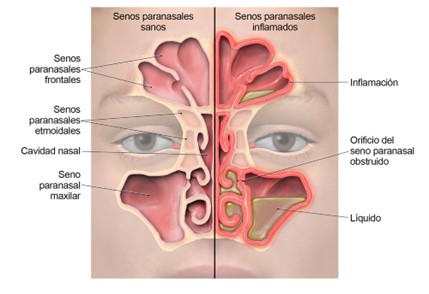 - Infección y/o inflamación de la mucosa ciliar nasal que origina una alteración para conducir la mucosa fuera de los senos paranasales, provocando la obstrucción.